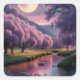 This enchanting fantasy illustration showcases a tranquil river flowing beneath a glowing full moon, surrounded by lush greenery and vibrant flowering trees. The dreamy color palette of purples, pinks, and soft greens creates a magical, calming atmosphere that feels both surreal and serene. With its balanced composition, reflective water, and celestial focus, this artwork is perfect for lovers of fantasy landscapes, moonlit scenes, and imaginative nature-inspired visual art.