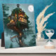 Beautiful tabletop art plaque design created using AI rendering software features a mystical, magical, fantasy treehouse on a moonlit night.
