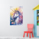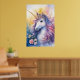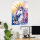 Poster of a majestic unicorn with a golden horn surrounded by vibrant flowers. Its mane flows in shades of purple, pink, and blue, blending seamlessly into a soft, dreamy backdrop.