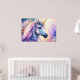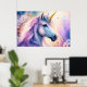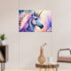Poster with a majestic unicorn amidst a dreamy background of soft pastel colours with a flowing mane adorned with delicate flowers, creating an enchanting scene.