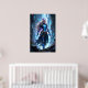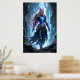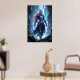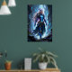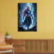 A fantasy warrior woman with long blonde hair, adorned in intricate blue and gold armour, stands in a canyon of futuristic, glowing buildings. Clear details and vibrant colours enhance visual appeal.