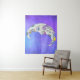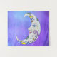 This wall tapestry has a fantasy white moon with a face and brightly coloured abstract geometric shaped accents in yellow, blue, and purple in a hazy purple sky with dotted white stars.