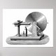 Drawing of Faraday disc, the first electromagnetic generator, invented by British scientist Michael Faraday in 1831. The copper disc (D) rotated between the poles of a horseshoe shaped magnet (A), creating a potential difference between the axis and rim due to Faraday's law of induction. If an electrical circuit such as a galvanometer was connected between the binding posts (B) and (B') the motion induced a radial flow of current in the disc, from the axle towards the edge. The current flows into the spring contact (m) sliding along the edge of the disc, out of binding post (B') through the external circuit to binding post (B) , and back into the disc through the axle. Turning it in the opposite direction reverses the direction of current. The caption also says that passing a current from a Bunsen cell (battery) through it would cause the disc to turn, making it function as an electric motor. The labelled parts are given in the caption as: