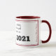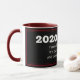 Modern, minimalist NEW YEAR Coffee Mug showing black and white halves with thin red borders. The text reads 2020 FAREWELL IT'S OVER AND DONE, LOOKING FORWARD NOW TO 2021. On one side there is a vertical HAPPY NEW YEAR, which is CUSTOMIZABLE so you can personalise with your name or own greeting. A stylish New Year mug to say Farewell to 2020 and to embrace the New Year ahead.