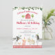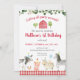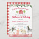 This cute birthday invitation features watercolor farm animals with greenery floral accents, confetti and a red gingham border.