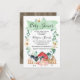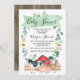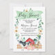 Sweet farm themed baby shower invitation featuring three watercolor farm animals, a cow, pig and goat. The design also includes a banner and foliage and white floral wreath.