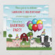 Destei's original cartoon illustration of farm animals wearing colourful birthday hats and holding birthday balloons. There is a pink pig, a sheep and a black and white cow. The cow is holding the colourful birthday balloons in her mouth. On the back there is a red barn and some trees placed on green grassy hills. There are two chickens in front of the barn as well. The sky is blue with some clouds. The front reads: "Join us for a barnyard party" while the back has more personalizable text areas for the details of the event. On the back there is also an image of the barn and green hills.