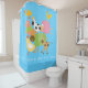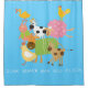 Shower curtain with silly farm animals including chickens, pig, cow, goats, sheep, and a duck with text that reads Oink Quack Baa Moo Cluck!
