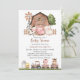 Invite friends and family in style and set the tone for your special day with this charming baby shower invitation. Design features farm animals (cow, horse, sheep, pig, rooster, chicken), brown barn and brown tractor on white background.