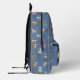 Kids backpack with farm animals design. Grey-blue background colour with pattern of sheep, goats, pigs and donkeys covering all sides. The front zippered pocket image is a bull with a goat, lamb, cat and puppy. Add his or her name to this area in tan, printed font.