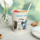 Boy's birthday party paper cups. Farm themed design with barnyard animals and blue tractor image that wraps around cups that come in two sizes. Include your choice of text, in chunky blue lettering, across the top. Cups can also be purchased with lids.