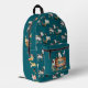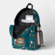 Kids backpack with cows, goats and chickens design. Personalise this pretty teal blue pack with child's name. Farm themed pattern is perfect for boys or girls and features a fun collection of barnyard friends. More animals line up across the zipper and side sections. The name template is over a rustic wooden sign on the zippered pocket.
