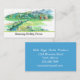 A business card for a hobby farm featuring a peaceful country setting with cows grazing in the pasture, red barns in the distance next to the mountain range drawn with ink and painted with watercolor.