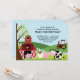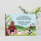 This cute birthday party invitation features a farm scene with farm animals, a big red barn and a farm tractor.