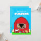 Birthday Party Invitation with a red barn with lots of farm animals. The front has join us on the farm while the back has the party information. Turquoise background with white font.