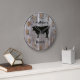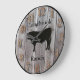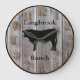 Personalise this custom barnwood styled clock with your farm, ranch, or stable name to add a personal touch to the decor. Perfect for the rodeo or livestock barn. Barnwood look clock face with beef bull cow silhouette in centre. Choose one of two sizes and two colours of clock hand, whichever is to your liking.