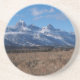 Teton mountains in Wyoming with snow and low clouds behind a homestead farm in Grand Teton National Park.