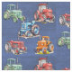 Denim blue fabric with farm tractors pattern. Tractor images are green, red, blue and orange and are printed over a dark blue denim colour. The fabric is not denim, it is part of the design only.