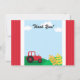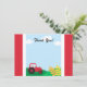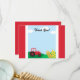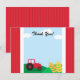 Fun, flat birthday party thank you card for kids with farm / tractor theme. The thank you card features a red cartoon tractor, green hills and wheat. Customisable text "Thank you". On the back is an illustration of a red barn wall. Perfect for farm themed birthdays.