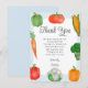 A cute farmers market boy baby shower flat thank you card. Design features hand painted watercolor vegetables on a pastel blue gingham background.