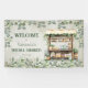 Beautiful forest and sage green eucalyptus and boutique Farmer's Market "Welcome" horizontal sign design. Rustic aged-look front background combined with the greenery laden wood stand and the surrounding overhanging eucalyptus is reminiscent of an open air Italian or country marketplace.