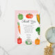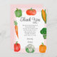 A cute farmers market girl baby shower flat thank you card. Design features hand painted watercolor vegetables on a pastel pink gingham background.