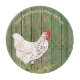 Custom and personalise this design. If you love rustic farmhouses, and country looks, then this design is for you. The pattern on the background is wood planks that have chippy, worn green paint to give this a warm, primitive, cottage look. At the top, is where your text will go, The font is a fun grunge, vintage looking that matches the peeling painted wood. Below, a chain link fence and a white chicken in watercolor and ink. The chicken has a line drawing or illustration style, and is standing on bright-coloured grass.