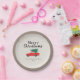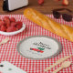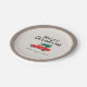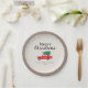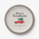 Accent your holiday gathering with this trendy farmhouse style paper plate. The design is accented with a vintage watercolor graphic of a red car hauling a fresh cut Christmas tree on top. Handwritten style calligraphy reads "Merry Christmas" with custom text for your family name.
