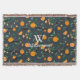 Pretty country farmhouse style citrus orange fruit botanicals pattern and dark grey/navy background throw blanket featuring your personalised monogram letter and thick white script family name.