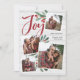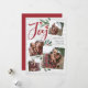 Our beautiful rustic chic holiday photo card features four of your favorite square family photos in a collage layout. "Joy" appears at the top in festive red hand lettered brush script typography on a white wood plank shiplap background accented with green watercolor leaves and red holly berries. Customize with your family name and individual names.