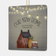 This rustic primitive new home Christmas ornament features a Saltbox House grouping with a grungy candle, saltbox house and a pineapple. A string of vintage string lights hangs overhead. Personalise your ornament with your address, using Zazzle's easy to use design tool. Background is rustic wood.
