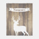 White buck deer silhouette with a decorative ribbon banner design containing your personalised family name in dark brown text. Background is light farmhouse barn wood planks.