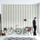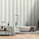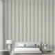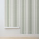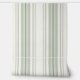 This wallpaper features modern farmhouse ticking stripes in shades of sage green on cream.