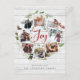 A festive holiday card design that features eight of your favorite photos arranged in a round wreath design accented by green watercolor foliage, pine cones and red holly berries on a white farmhouse wood shiplap background. "Joy" appears in the center in festive red hand lettered brush script typography. Personalize this unique holiday photo collage design with your custom Christmas greeting and names at the bottom, and add a longer pre-printed message to the back.