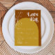 This wedding menu features a burnt orange background, mustard coloured arch, earth child florals and a fun 70's themed font. This groovy dinner menu is perfect for a retro wedding, baby shower, or any other special event. All colours are editable, just click the blue 'edit using design tool' button to customise the colours to match your event. Pair with anything in the FARRAH Collection for a cohesive look.