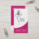 Fashion illustration, hand drawn, black and white of a stylish woman .Sweepingly pink curve leaves one side white and the other shocking pink. The backside shows the same colours and pattern in reverse. Name and dates are written in a stylish, clean typography.