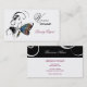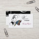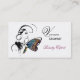 Hand drawn fashion illustration of a beautiful woman with a multicoloured butterfly on her shoulder. The backside shows a black stripe decorated with some white swirls. .Perfect to show your clients your sense for style and glamour. For professionals in the beauty- and fashion industry. Elegant and trendy typography.