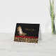 Stylish ladies thank you note card done in black, with a black and brown spotted jaguar fur pattern, across the bottom. Graphics of a dark red satin looking ribbon, runs across the top of the damask pattern, and a jaguar pattern pair of stiletto high heels decorates the top black background. Golden yellow text, on front, and the black text inside the card is ready to personalize to suit your needs.