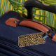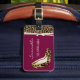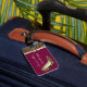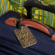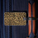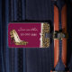 Chic lady's luggage tag done in maroon, with graphics of a brown and black jaguar fur pattern, with an ivory ribbon, and a pair of jaguar print stiletto high heels, on the front. Personalise the ivory text to suit your needs. A stand out luggage tag that is hard to miss.