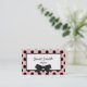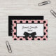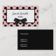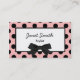 Stylish business card done with a whimsical pink frame, with black polka dots around a black framed white text area. Graphics of a black bow at the bottom of the frame gives this card a retro fashion look. Black text on the front and white text on the solid black back, is customisable. Personalise all the text, on the front and back, to suit your needs.
