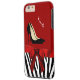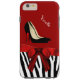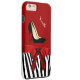 Fashionable iPhone 6 Plus case done in red, on the top and a black and white striped zebra print, on the bottom. Graphics of a red satin ribbon and bow decorates the middle and a pair of black stiletto heels are on the top half. Personalise the white text for yourself or as a great gift idea.