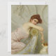 This design features a painting by the Italian artist Vittorio Matteo Corcos (1859–1933). It depicts an attractive and finely dressed young woman. She is playfully kneeling on a wooden crouch as she looks over at the viewer. She is leaning over with her hand and stroking her small pet puppy on the nose with her fingertip. The dog seems startled but awestruck by the lady. There are elegant stone friezes in a classical style behind the young woman, indicating that she lives in a very grand and opulent house. The lady is wearing a low-cut pink dress that shows off her slender curves. She is not afraid to flaunt her natural beauty. The puppy dog is white with a brown face and ears. It also has a pink collar, which is made out of some luxurious fabric, tied around its neck. The edge of the furniture on which the lady is leaning is gilded with intricate patterns. The original artwork was painted by Vittorio Matteo Corcos in 1895.