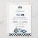 This fun 1st birthday party invitation features a vintage blue race car and chequered flags. Designed by Thisisnotme©