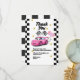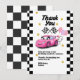 Send high-speed thanks with this girls’ racing-themed thank you card! Featuring pink accents and chequered flags, it’s perfect for race car or “fast one” birthday parties.