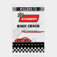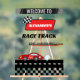 Fun race car theme boy's birthday party welcome sign featuring illustration of a red retro race car. The text says "welcome to xx track".