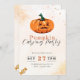 This invitation captures the spirit of Halloween with its radiant and thematic design. Set against a light orange backdrop adorned with glistening orange glitter, stars, and candy, this invitation exudes the magic of the season. At the top, a plump and cheerful jack-o'-lantern takes centre stage, adding a touch of whimsy to your pumpkin carving celebration.