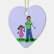 Father and daughter hold hands. The dad's shirt read "daddy" and the little girl's dress reads "me". The family has black hair and tan skin. The image comes in multiple colour versions. There is also a no colour drawing version too. Personalise the daddy and daughter ornament with family names or a personal message for a special father or daddy button pendant gift! You can make custom family ornaments for a special Father's Day gift, new Daddy, Family Reunion or other customised family art gifts!