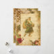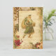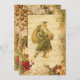 Beautiful holiday collage design featuring vintage Christmas ephemera, including green-robed Father Christmas with musical notes, brass bells, pine, roses and holly on grungy distressed gold parchment background with engraved pine and subtle snowflakes.