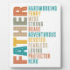 Bold, vibrant, and full of heart—this design captures the essence of fatherhood in a striking, visually dynamic layout. The word FATHER stands tall in bold, patterned lettering, serving as the foundation for a collection of attributes that define the role: hardworking, funny, wise, strong, brave, adventurous, devoted, fearless, loving, protector, hero. Each word stands out in a lively array of colours, creating a powerful representation of the many hats dads wear every day. This is more than just a tribute—it’s a celebration of their unwavering love, resilience, and impact. Perfect for Father’s Day, heartfelt gifts, or a reminder that dads are, indeed, the ultimate unsung heroes!