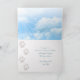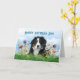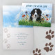 Father's Day card with Bernese Mountain dog on the front. Horizontal, folded card with message inside. Give to dad from the dog, or from the family. The dog is lying among wildflowers and green grass, with a blue sky as the background. "Happy Father's Day" printed text on the front in dark blue. Include a personal message inside using a hand-written font. A trail of paw prints are next to the wording. The back of the card has a pattern of paw prints. Choose the printed card, or download version.
